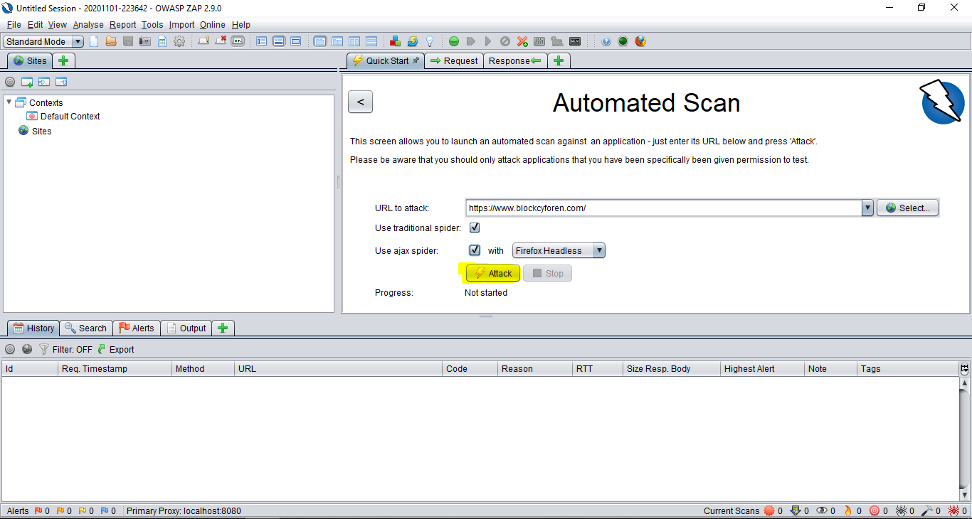 Otomatik taramada; url adresini url attack kısmına yazıp attack butonuna tıklamamız yeterli daha sonra kendisi tarama işlemini otomatik bir şekilde gerçekleştirecektir.