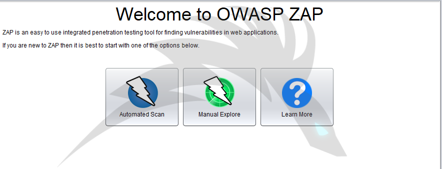 Owasp zap çalıştırılır Windows işletim sistemlerinde kurulduktan sonra çift tıklayarak çalıştırılabilir veya Kali Linux sistemlerde terminal ekranına “owasp-zap” yazılarak çalıştırılır.