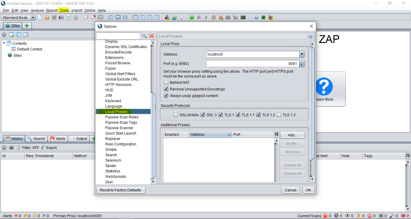 Tools -> options -> Local Proxy altında zap proxyin hangi porttan istek alacağını görüntüleyebiliriz.