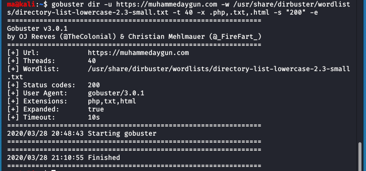 gobuster dir -u https://muhammedaygun.com -w /usr/share/dirbuster/wordlists/directory-list-lowercase-2.3-small.txt -t 40 -x .php,.txt,.html -s "200" -e