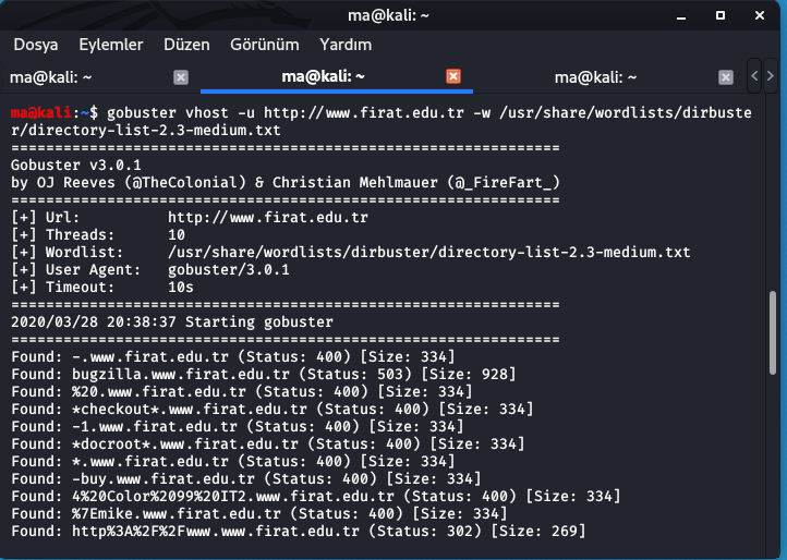 gobuster vhost -u http://firat.edu.tr -w /usr/share/wordlists/dirbuster/directory-list-2.3-medium.txt