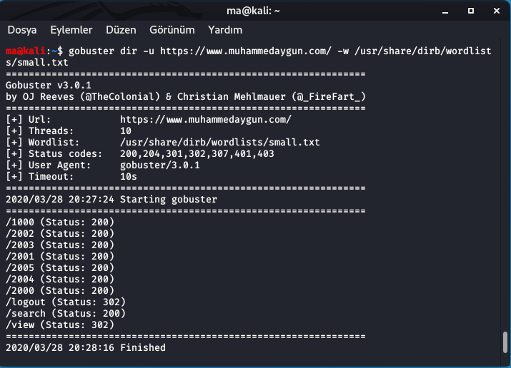 gobuster dir -u https://www.muhammedaygun.com -w /usr/share/dirb/wordlists/small.txt