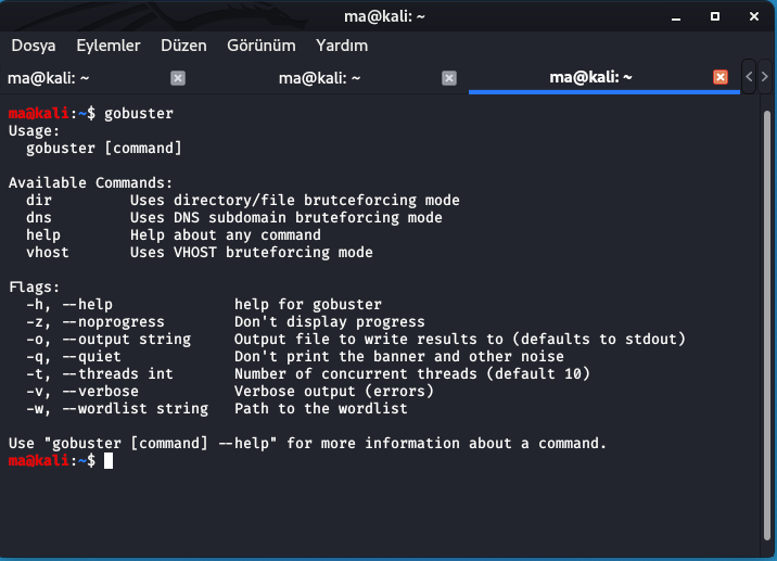– dir – klasik dizin (brute-force) kaba kuvvet modu (Web sitelerinde dizinleri ve dosyaları tespit etmeye yarar)