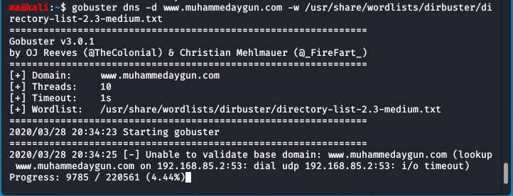 gobuster dns -d www.muhammedaygun.com -w /usr/share/wordlists/dirbuster/directory-list-2.3-medium.txt