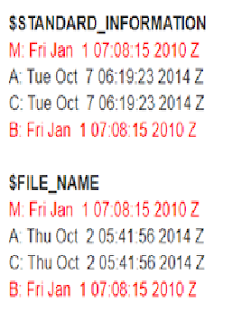 Çoğu zaman time stomping yöntemini uygulayan zararlılar yalnızca $STANDARD_INFORMATION kümesini değiştirir. Hem $STANDARD_INFORMATION hem de $FILE_NAME özniteliklerini görüntüleyen araçları kullanarak, bir dosyanın zaman değişimine uğrayıp uğramadığını belirlemek için iki kümedeki değeleri karşılaştırabiliriz. $STANDARD_INFORMATION daki değeler $FILE_NAME’den daha önce geliyorsa geliyorsa, olası bir şüphelenmemiz gerekmektedir.