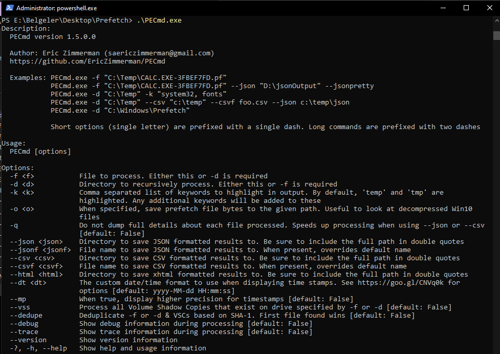 PECmd yazıp enter tuşuna basıyoruz. Tool hakkında bilgi ve kullanımı parametrelerini görebiliyoruz.