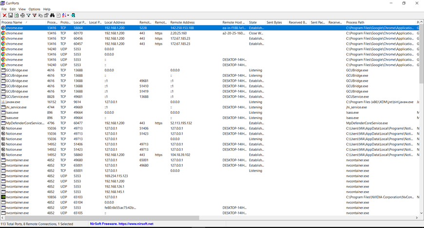 CurrPorts, Windows işletim sistemlerinde çalışan bir ağ izleme ve analiz aracıdır. Bu araç, sisteminizdeki açık TCP/UDP portlarını ve bunlara bağlı aktif ağ bağlantılarını listelemek için kullanılır. Ağ güvenliği ve sistem analizi için oldukça faydalıdır.