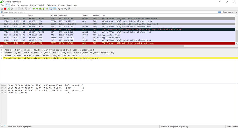 Wireshark, ağ trafiği izleme ve analiz etme için kullanılan en popüler network forensics araçlarından biridir. Hem gerçek zamanlı trafik yakalama hem de daha önce kaydedilmiş PCAP (Packet Capture) dosyaları üzerinden analiz yapabilme yeteneği vardır. Wireshark, ağdaki iletişimi derinlemesine incelemek için paketlerin detaylı dökümlerini sunar ve network forensics, performans izleme, güvenlik analizleri gibi birçok alanda kullanılır.