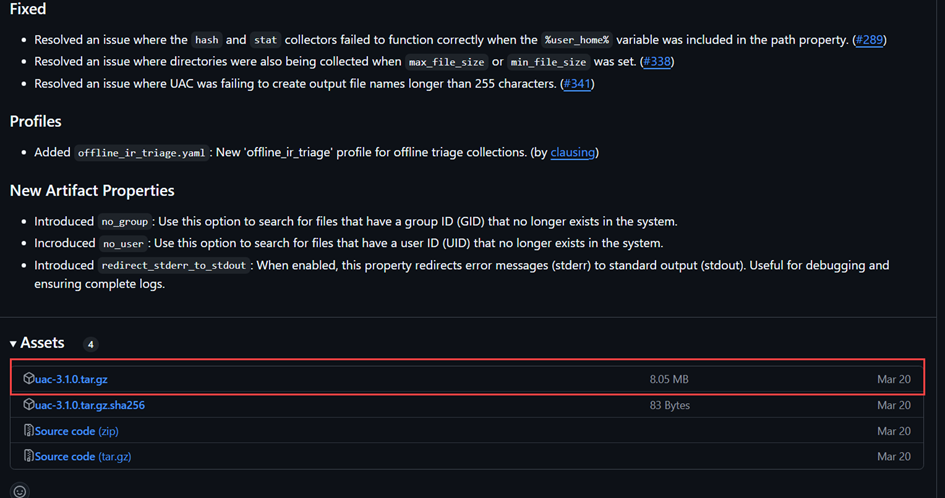 Sonuçlar, UAC komut satırında belirttiğiniz hedef dizine kaydedilir. Sonuç dosyasının adı “uac—.tar.gz” biçimindedir. Bu şekilde, aynı sistemde UAC’yi birden fazla kez çalıştırabilir ve çakışma olmadan verileri toplayabilirsiniz. Ayrıca, birden fazla sistemin .tar.gz dosyasını tek bir büyük toplama dizinine kaydedebilirsiniz.