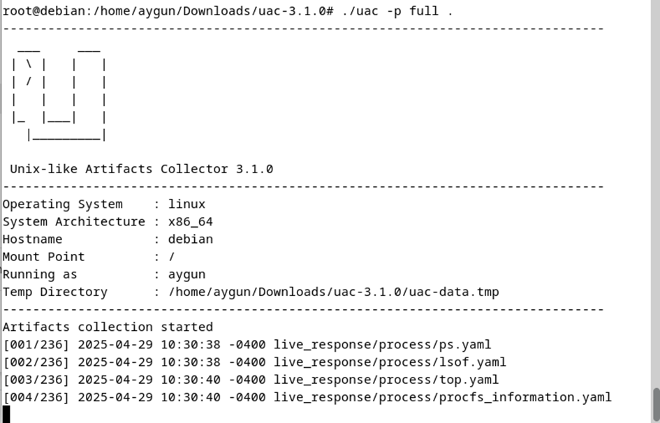 - UAC aracını root olarak çalıştırın ve toplamak istediğiniz artefaktları listeleyen bir profil dosyası belirtin.