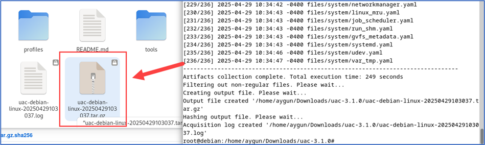 4. Belirtilen artifackleri toplar ve sonuçlar başka bir *.tar.gz dosyasına kaydedilir; bu dosyayı kolayca başka bir sisteme kopyalayarak analiz edebilirsiniz.